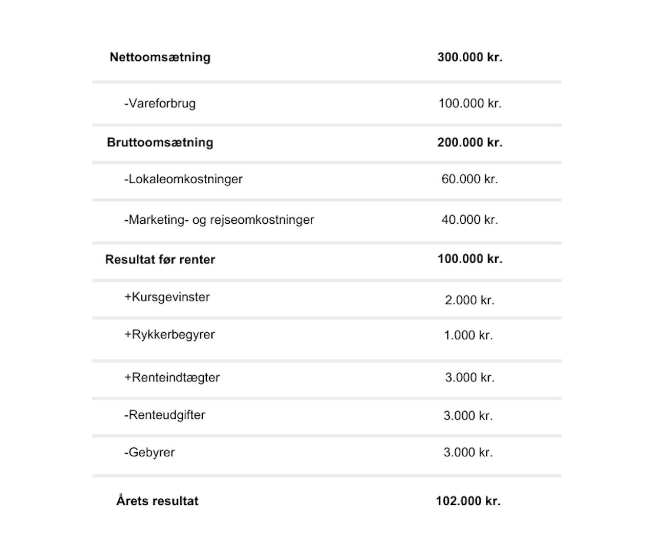 Nedenfor kan du se et eksempel på en samlet oversigt over indtægter og omkostninger, hvilket udgør en resultatopgørelse: