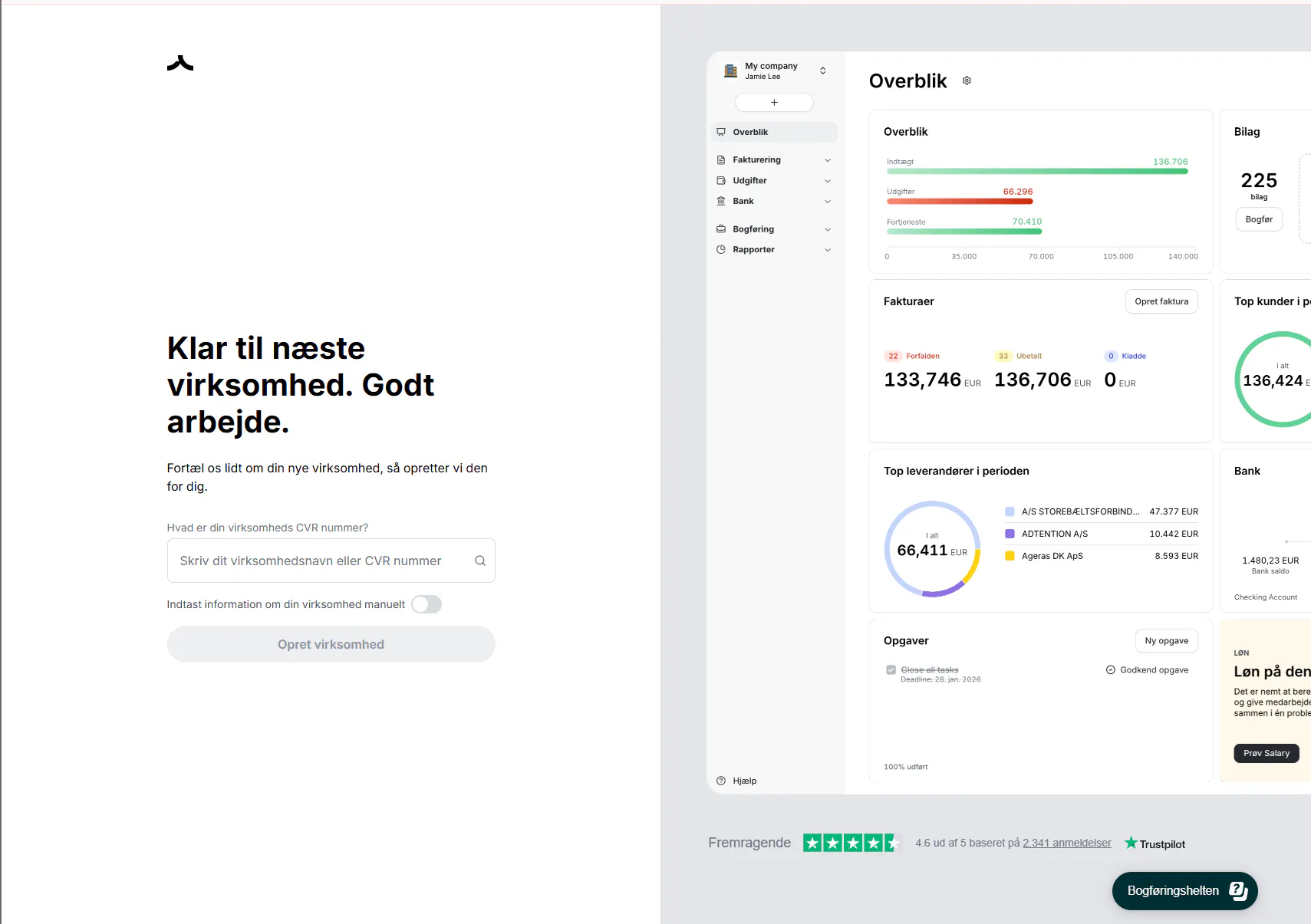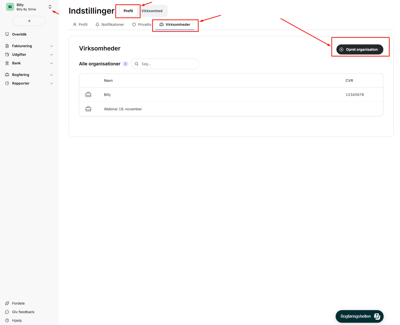 Du har nu oprettet din nye virksomhed, du kan skifte mellem dine virksomheder ved at klikke på navnet i venstre hjørne