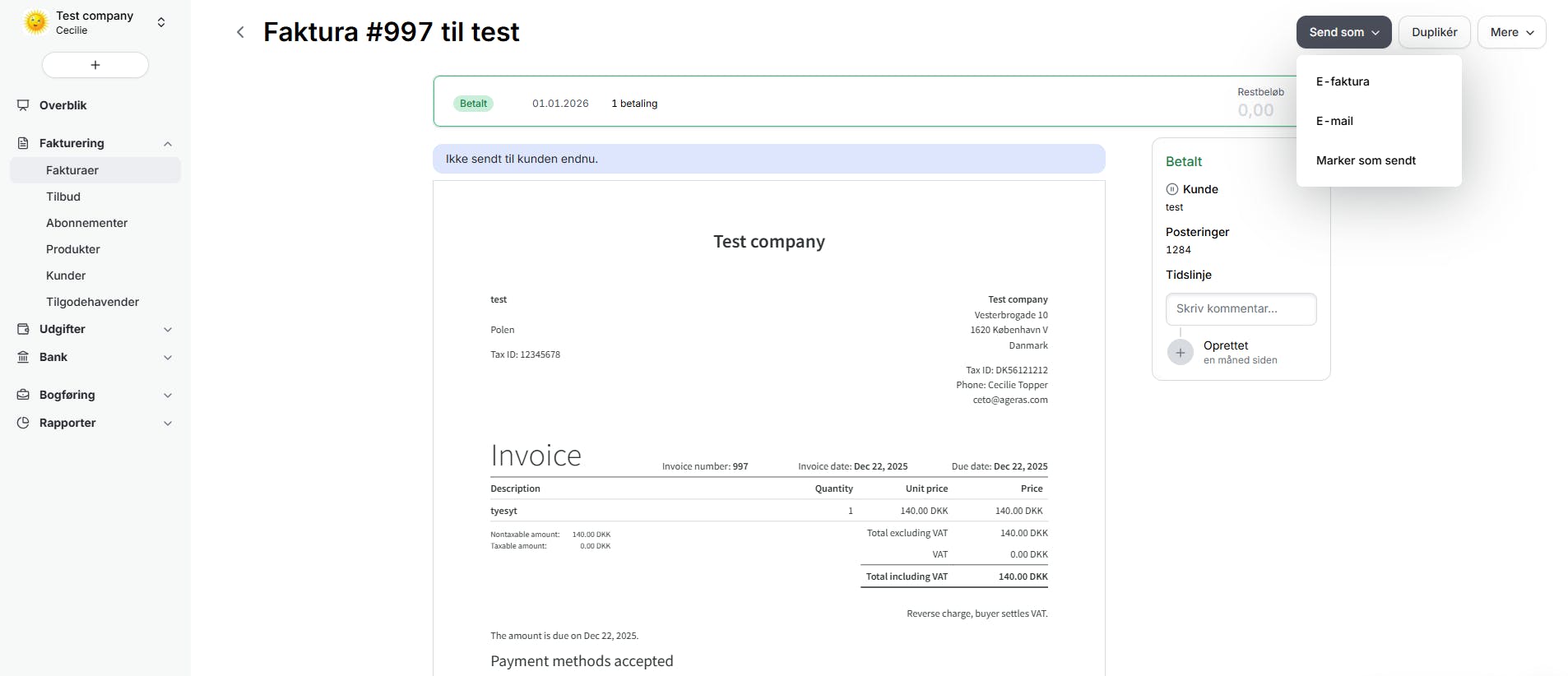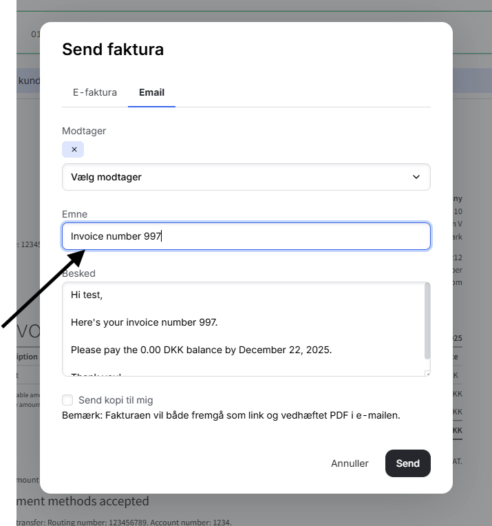 - Nu kan du ændre emnefeltet for den konkrete faktura og efterfølgende sende fakturaen