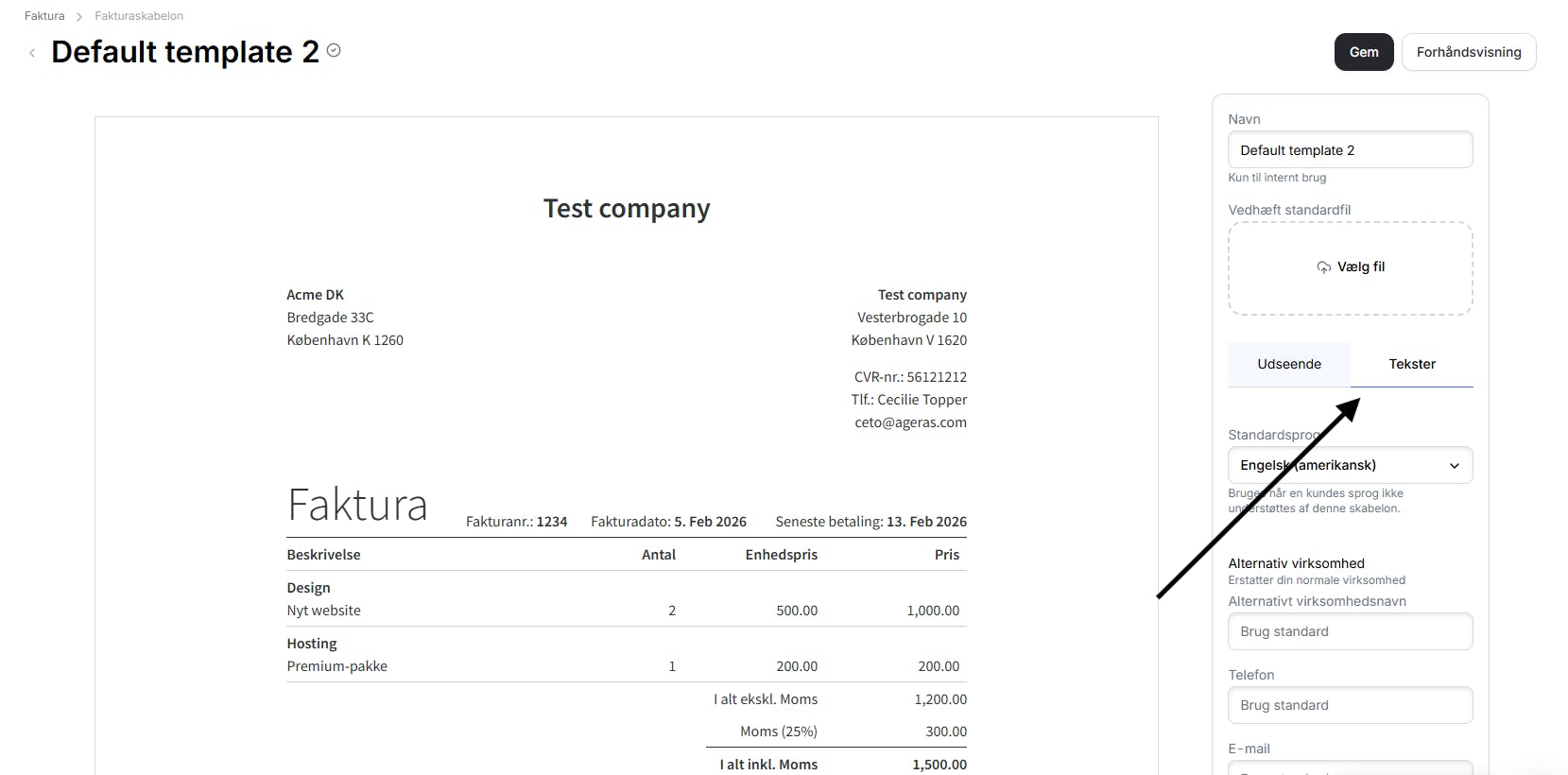 Du kan ændre på flere af standardindstillingerne for en faktura gennem vores fakturadesigner. Læs vores artikel om fakturadesigneren og bliv klogere på hvordan du f.eks. ændrer tekst, farve, standardbeskrivelser, binavne mv.