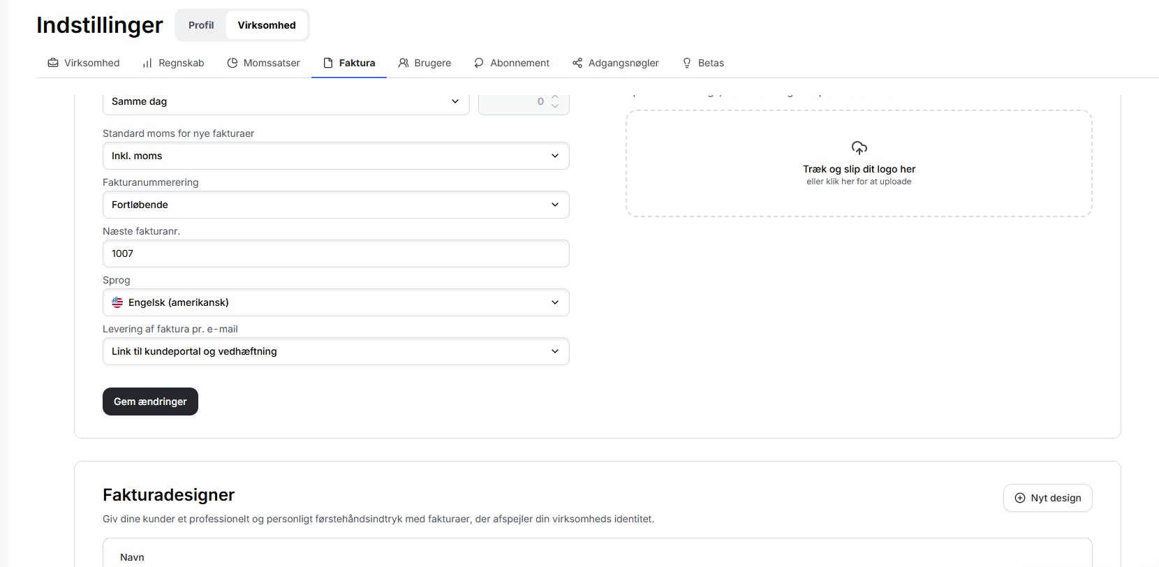 - Gå til Indstillinger > Virksomhed > Fakturadesigner > Opret nyt design