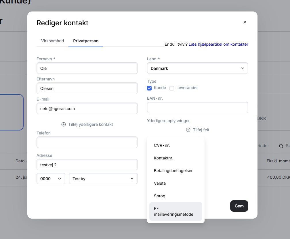 Hvis du vil have forskellige leveringsmetoder til dine kunder, kan du sætte forskellige leveringsmetoder på hver kunde i Billy. Det gør du ved at rette kontakten og vælge leveringsmetode.