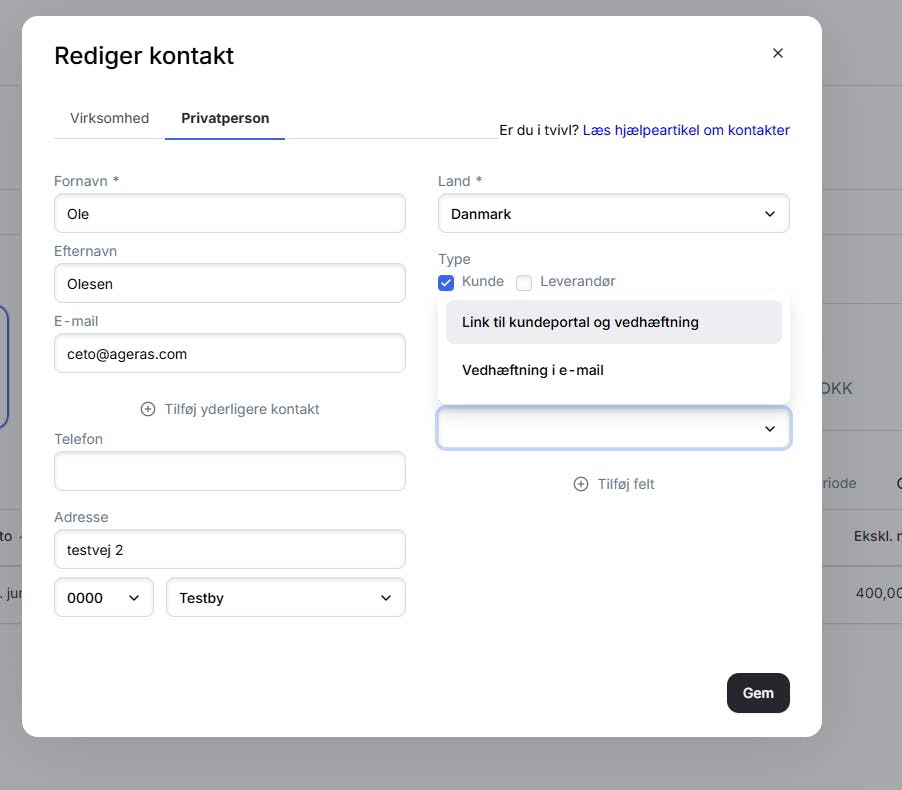 - Du kan vælge imellem Link til kundeportal eller Vedhæftning i e-mail.